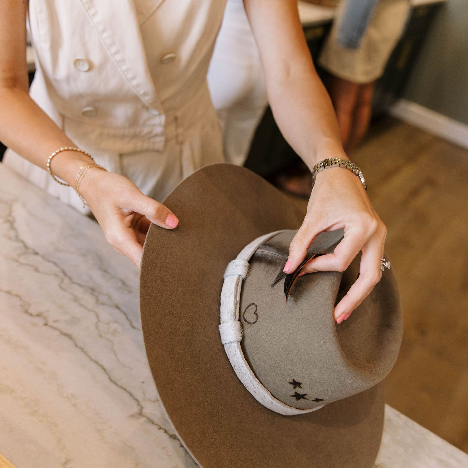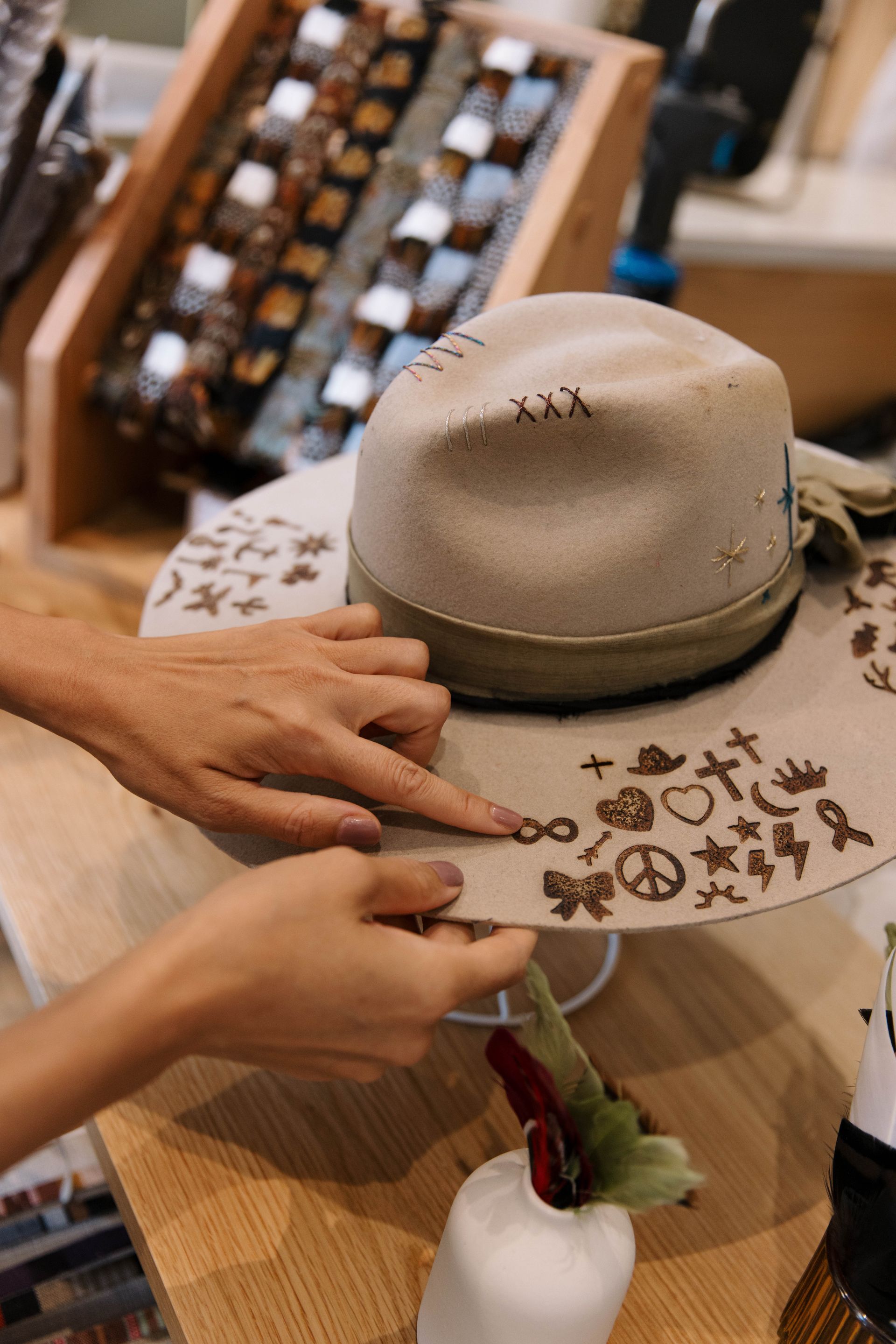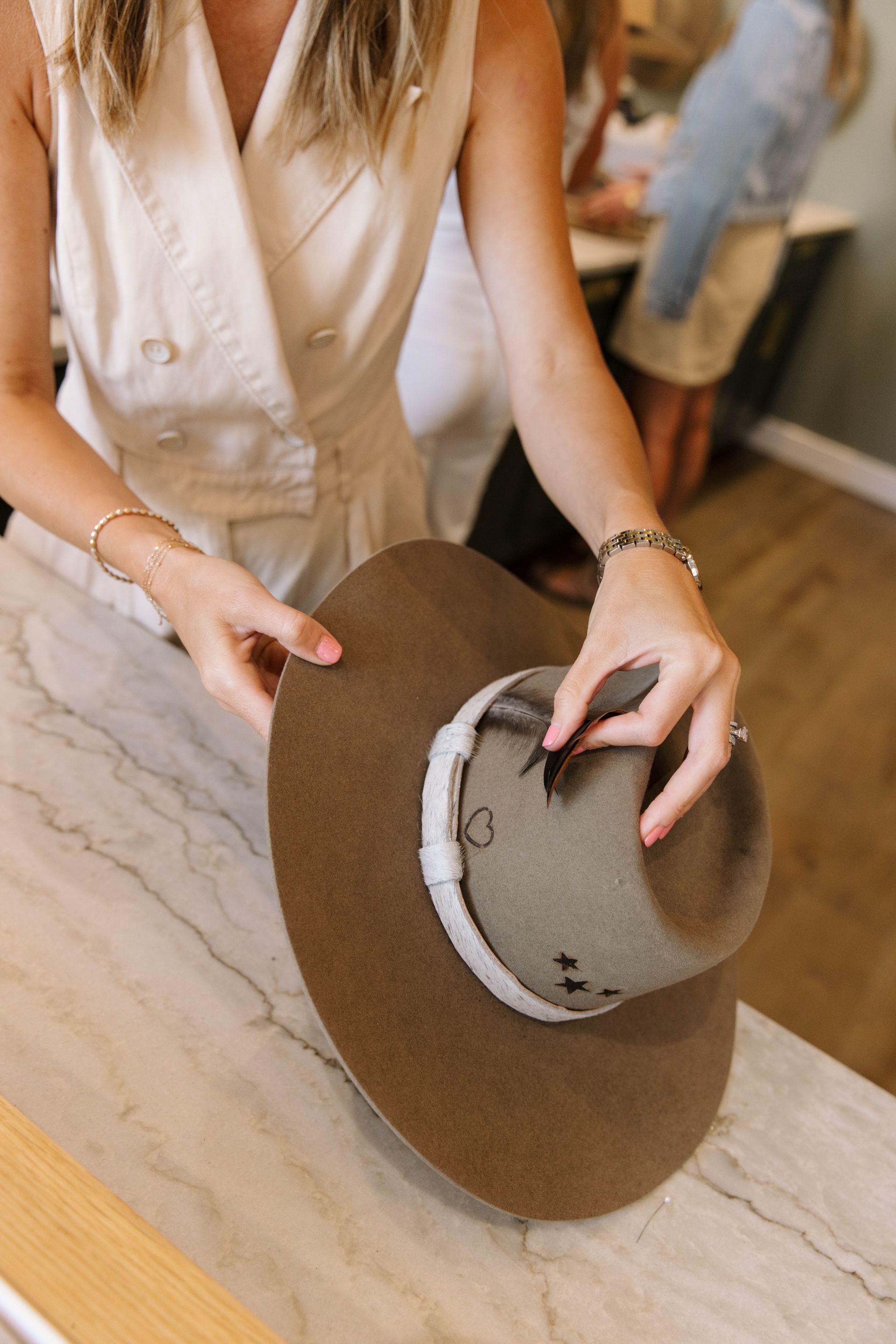 Choose a hat that speaks to you and relax at our hat bar with a complimentary local beverage. Our trained stylists will work with you to create a personalized hat through our steaming and shaping process. Personalization options include hat bands, ribbons, stitching, pins, charms, feathers, and branding.